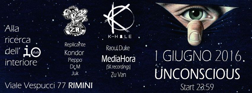 Mercoledì 1 giugno 2016 l’IO Street club di Rimini festeggia l’evento intitolato Unconscious, una notte musicale per celebrare l’uomo alla ricerca del proprio io interiore. La nottata è targata K-Hole in collaborazione con ZR Projeckt.